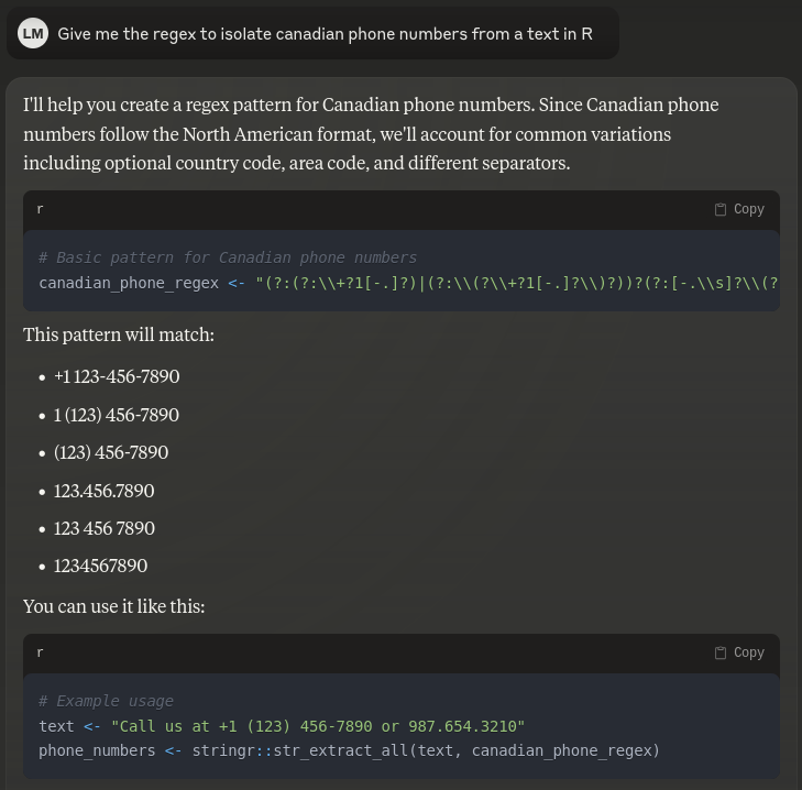library(stringr)# Notre textetext <-"Contact: Marie (514-555-1234), Pierre (438-555-5678)"# Trouver tous les numérosnumeros <-str_extract_all(text, "\\d{3}-\\d{3}-\\d{4}")# Résultatprint(numeros)# [[1]]# [1] "514-555-1234" "438-555-5678"